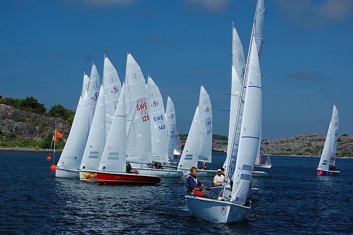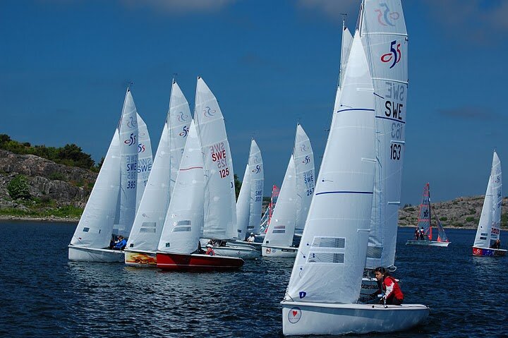 Starten andra racet. Juniorerna från Värmdö Jolleseglare, SWE 163, tar det säkra före det osäkra, och startar en bit ner på linjen där det är gott om plats. Ihrfelt/Ihrfelt i röd båt har skotat focken för hårt och riskerar att hamna i lä om båtarna ovanför. Raggarna med flammorna ligger bra till. Räcker farten? Båten ovanför Raggarna skär linjen på skottet.