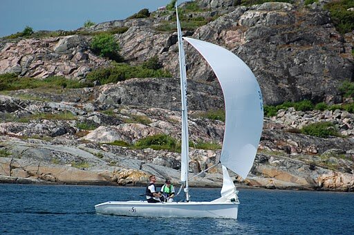 Juniorerna från Värmdö i SWE 163 kommer fint i väg, fria från störningar. Röd båt överkompenserar fockskotningen och släpper för mycket. SWE 385, “www.regatta.nu”, hade högst fart i startögonblicket, och är snart fria från alla störningar från andra båtar. En utmärkt start av SWE 385, kan vi hoppas att vi håller på att bryta den onda cirkeln av dåliga starter? Vi hoppas på det!